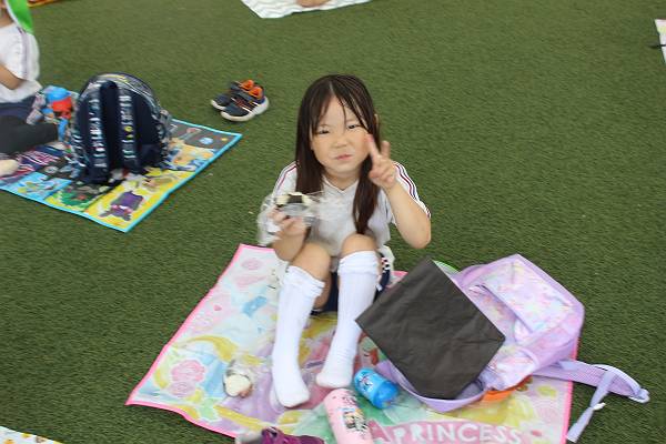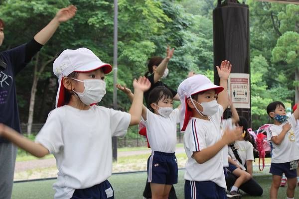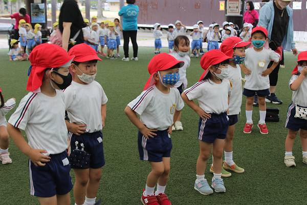広場で雨宿りしながら、小リズム会のお遊戯をみんなで楽しく踊りました♪